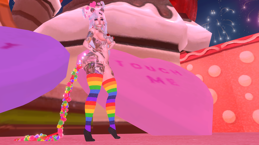 ice cream, lollipop, bag, belt, garter, hat, glasses, candy necklace, earrings, heels, small heels, nerds rope tail